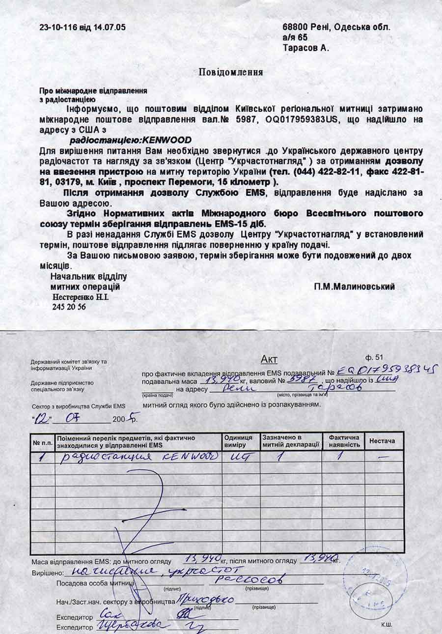 Разрешение на ввоз получаем в "Укрчастотнагляде" - в уведомлении есть координаты той службы. Для получения разрешения на ввоз в Укрчастотнагляд нужно предоставить копию своего разрешения, заполнить заявление и оплатить эту услугу. Таможня выставляет вам счёт к оплате, после оплаты которого и предоставления разрешения на ввоз, ваше радио благополучно отпускается и вы, с чувством огромнейшей благодарности за столь внимательное отношение к народным запросам, ожидаете его получения.