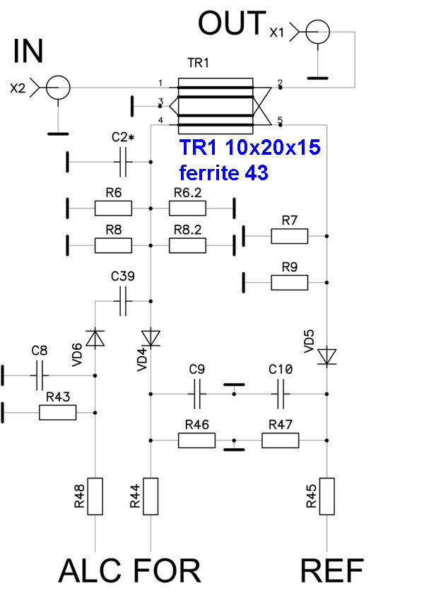 Сигнал ALC (см. схему - VD6) - порт отрицательного напряжения для управления выходной мощностью приемопередатчика. Для ограничения максимальной входной мощности усилителя.