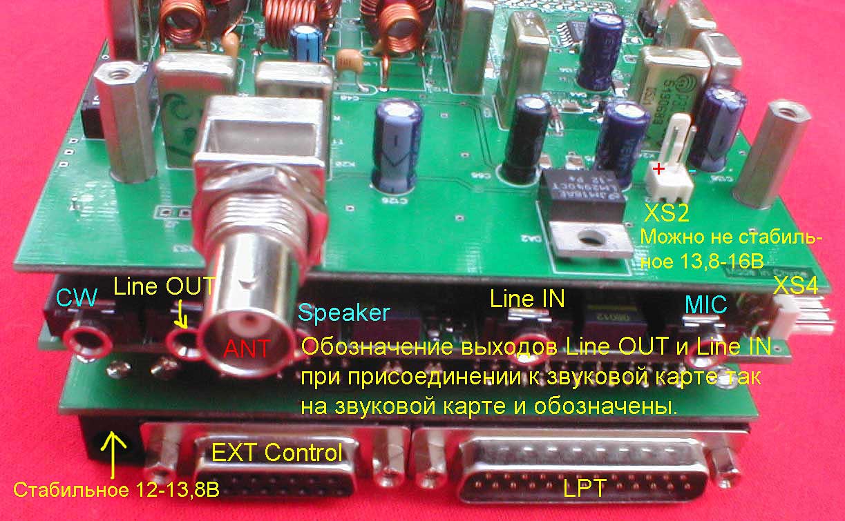 б.Line OUT – вот тут внимание! – обозначил его так, как он и обозначается на звуковой карте при соединении этого разъёма со звуковой картой. Это вход передатчика. Не забывайте, что на славянской территории мы называем все «тумблера» на стенках квартир выключателями, а американцы и вся остальная «цивилизация» эти тумблера называют включателями. Посему – чтобы не возникло разночтений в различных описаниях и все обозначения в моем варианте SDR совпадали в названиях с аналогичными разъёмами на SDR-ах иных производителей – называю их так, как они названы в американской версии SDR-а. Этот вход соединяем с линейным выходом звуковой платы. А американцы пишут TO LINE OUT, т.е. «на линию выход» - по иному – «соединить с выходом». По нашему этот разъём бы назывался «линейный вход».