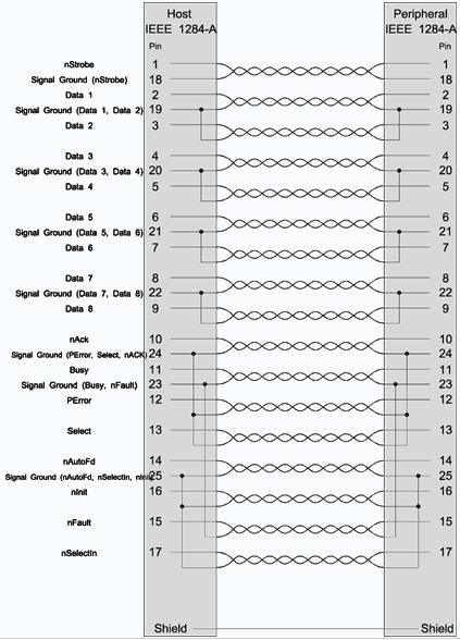 Разъём LPT – по этому разъёму идёт всё управление SDR-ом от компьютера. Соединяем его с одноимённым разъёмом (принтерным) на системном блоке компьютера качественным (!) шнурком. Что такое «качественный»? Это как правило толстый кабель в котором многожильные проводки в хорошем экране. Есть достоверная информация от пользователей этой техники о том, что хилый кабель снижает пороговую чувствительность приёмника и ухудшает его помехозащищённость. Разъёмы этого кабеля – спаиваем одноимённые пины в разъёмах. Т.е. №1 в маме с №1 в папе, №2 мамы с №2 папы и т.д. Пины №18-25 на корпусе. Ниже смотрим схему распайки. Напомню - для "ленивых" дядя Саша сделал запас таких кабелей, т.е. при потребности можно обращаться, см. -