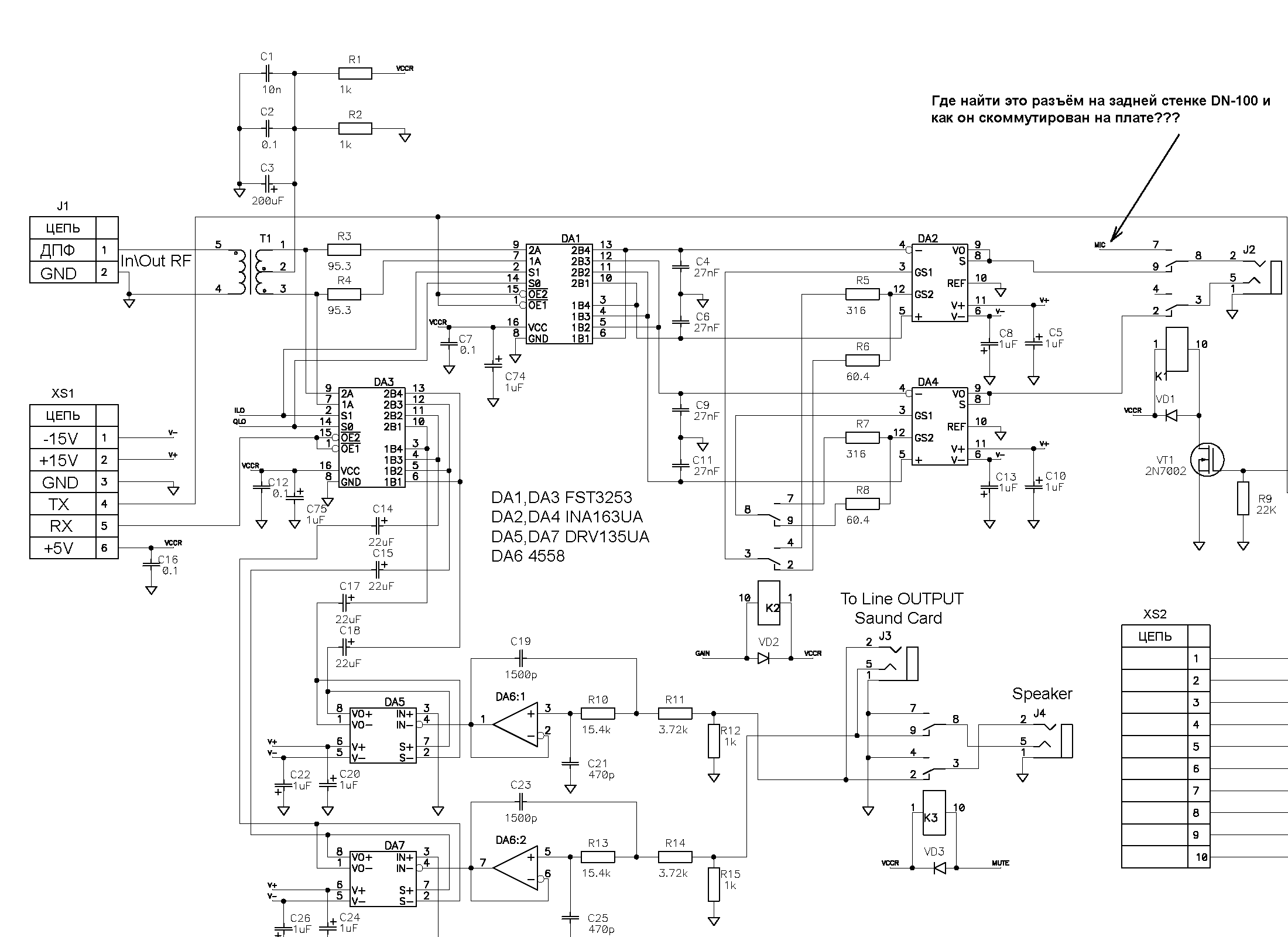 е.XS4 – разъём для микрофона с тангентой. Так называемой «мыльницы» или микрофона с кнопкой «приём-передача» на нём. Т.е. в американском варианте SDR-а на корпусе трансивера есть разъём для подключения такого микрофона. Тот разъём соединяется внутри SDR-а кабелем с разъёмом XS4. Вот такая «американская заморочка» с микрофонными разъёмами была оставлена при разводке платы, для желающих полностью скопировать американскую версию. Т.е. на корпусе крепим разъём для микрофона, который соединяем с разъёмом XS4 и выводим на звуковую карту с разъёма MIC. Чем это удобно? Кнопка РТТ у вас в руках. Не нужно выводить дополнительный шнурок на педаль TX-RX. В случае если вы не пользуетесь кнопкой РТТ на микрофоне, а работаете только педалью – тогда из разъёма XS4 можно вывести шнурок на педаль. Земля на микрофон пин №2 и общая земля платы пин №3 разделены. Следует это учитывать, если задумаете использовать разъём XS4 для вывода шнурка педали. Как вариант, при использовании звуковой карты, для которой требуется дополнительный микрофонный усилитель, например Дельта 44 (66), можно в корпусе СДРа установить дополнительный микрофонный усилитель (схема ниже, tnx RV3DLX), вывести его на разъём XS4 и через джек MIC соединить со звуковой картой.