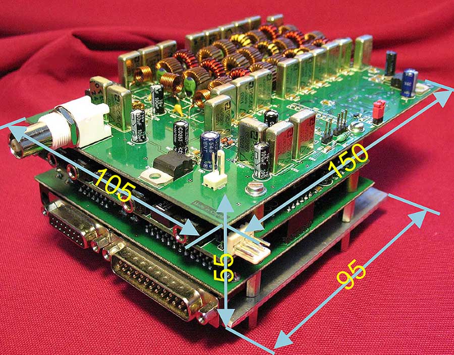 Габариты версии без корпуса смотрим на фото ниже. Высоту дал с учётом высоты установленных на плате элементов. Снизу плат металлическая пластина - это теплоотвод для стабилизаторов при обкатке такой версии СДРа. При установке в корпус теплоотводом служит стенка корпуса, к которой крепится СДР.