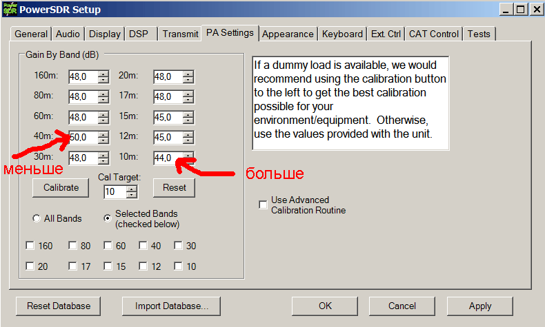 в)Учитывать различный менталитет славянского "соображе" и американского. А именно - у нас на стенках Выключатели, а у них Включатели. Т.е. когда будете крутить Gain By Band - мЕньшие значения усиления в окошках будут соотвествовать бОльшей выходной мощности, а не наоборот. Крутить аккуратно, т.к. усиление растёт быстро и в итоге цифирки усилений не должны отличаться друг от друга по диапазонам более, чем на 10 единиц.