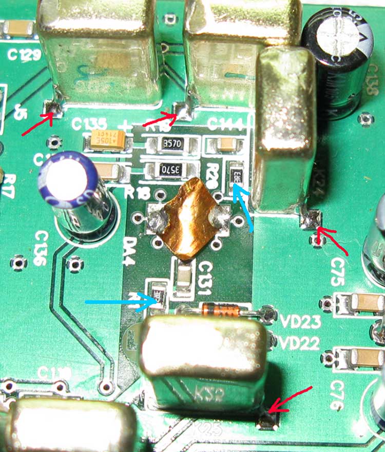 Для того, чтобы на будущее (вне зависимости от производителя тех микрух) исключить это явление - дополнительно в схему введены антипаразитные резисторы , на фото они выделены синими стрелками. И осуществляется дополнительно заземление корпусов реле для развязки и экранировки - на фото они выделены красными стрелками. Отказываться от этого варианта УВЧ не хотелось бы, т.к. он имеет очень высокие динамические и шумовые характеристики, но все возможные нюансы в будущем предусмотреть сложно - посему и "страхуюсь наперёд".