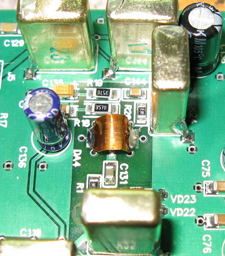 Один из пользователей СДРа (скорее всего у него предыдущая версия платы ДПФ) подсказал простейший вариант как ему удалось убрать возбуд УВЧ - т.е. накрыть ту микруху кусочком медной фольги припаянной к пятакам земли с обеих сторон от корпуса микросхемы. На фото показал, как это можно сделать в случае надобности.