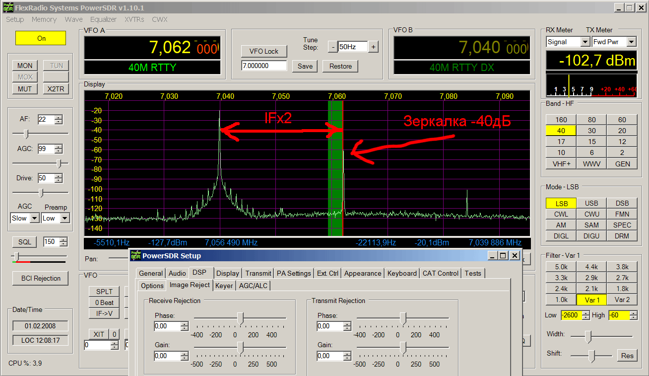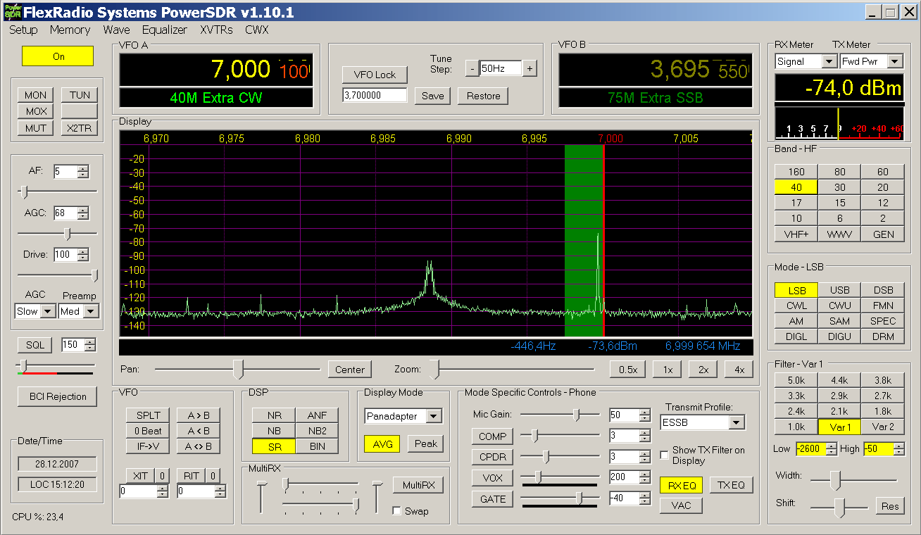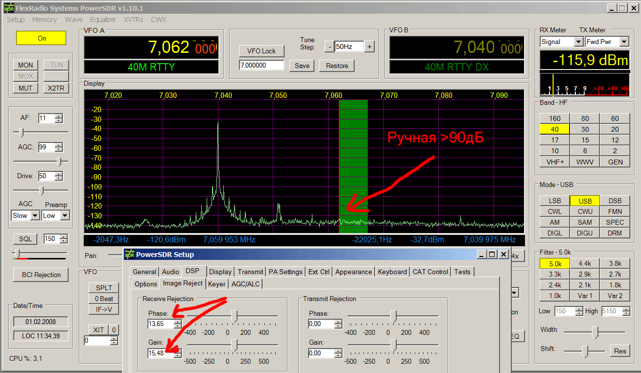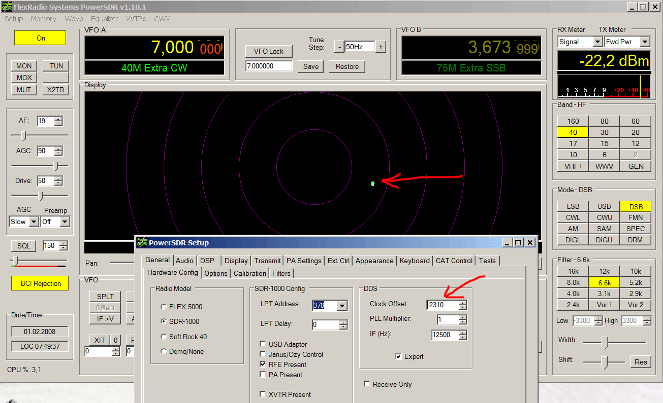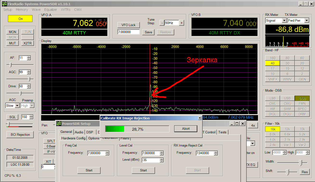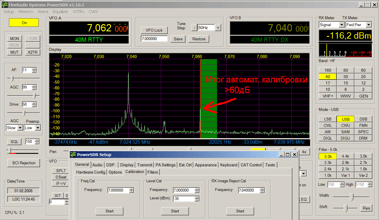 При калибровке SDR-а на различных уровнях из ГССов пришёл к выводу, что лучше калибровать на максимально возможном уровне, пока ещё не полезут «зубы» перегрузки на экране спектроанализатора PowerSDR. Вот некоторые калибровочные цифирки –