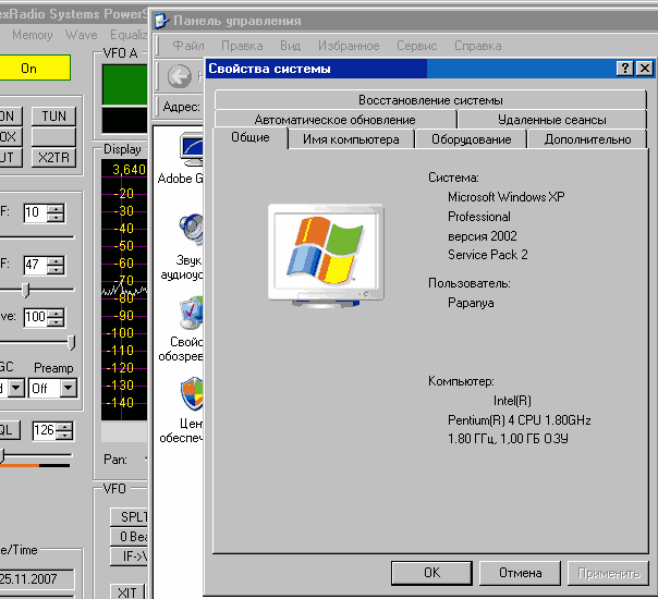 Значит, какую систему нам нужно в компьютере для SDR-а? Устанавливаем «обычную» систему виндовс ХР. Думаю, что подразумеваю под «обычной системой» думающий читатель догадывается? Т.е. не призываю вас бежать и искать компакт с системой, именно из рук Била Гейтса. Нам достаточно и компакта с системой виндовс ХР из любого ларька, торгующего таким продуктом. Смотрим на компакте в сопровождении к системе есть ли там уже автоматически устанавливаемые одновременно с системой сервис паки. Если нет – ищем компакт, чтобы там уже всё было. Как вариант – если в вашем виндовс нет этих сервис паков – спросите у любого мальчика, занимающегося этой темой – пусть он вам даст компакт с этими «заплатками» (это иное обозначение сервис паков). Сервис паки №1 и №2 можно установить и позже установки виндовс. Устанавливаем себе в компьтер виндовс ХР, если он без сервис паков – устанавливаем после установки системы сервис паки. Затем идём в Пуск -> Панель управления -> Система и глазеем – у вас теперь такая же система как и ниже на картинке? – всё, первый этап пройден!