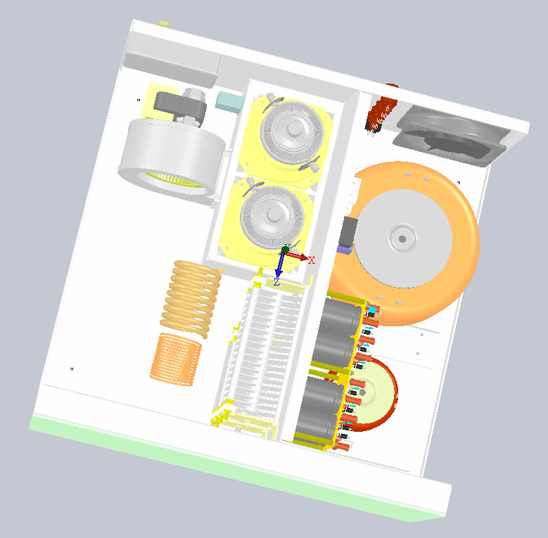 4.2хГУ-74Б - "классика" - возбуждение в первую сетку - фотки ниже. Тоже изготавливался из "того что было". Насколько сейчас помню - влёгкую до 1кВт на 29МГц. Получился достаточно тихий, но приличных размеров усилитель. Намаялся в нём с подбором точки размещения вентилятора. Не так просто равномерно обдуть обе лампы одним вентилятором. Неделю пускал дым под разными углами через вентилятор, пока нашёл ему подходящее место и правильный воздуховод. Осуществлена попытка ввести подобие "какого-то согласования" входа усилителя с выходом трансивера при помощи дополнительных резисторов. Схема есть на сайте. Впечатлила меня работа двух ГУ74-х в сравнении с 2хГМИ-11. На подоконнике стоял фонарь с встроенным УКВ ФМ приёмником, который постоянно пел песни местной ФМ станцией на 102,3МГц. Какое-то время пользовал УМ 2х74 - приёмник успешно пел песни никак не реагируя на близко излучаемые более 1кВт ВЧ мощности. Но когда вместо 2х74 на том же месте запустил 2хГМИ-11 - ФМ приёмник начал благополучно "хрюкать" в такт моему голосу при явно меньшей ВЧ мощности из усилителя...