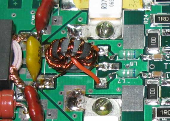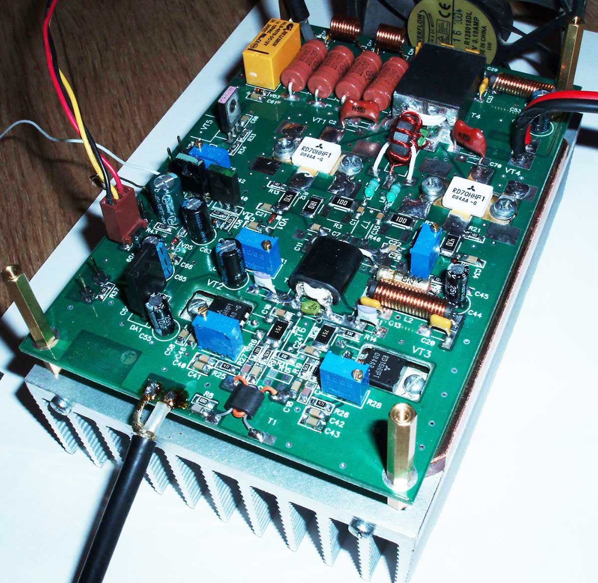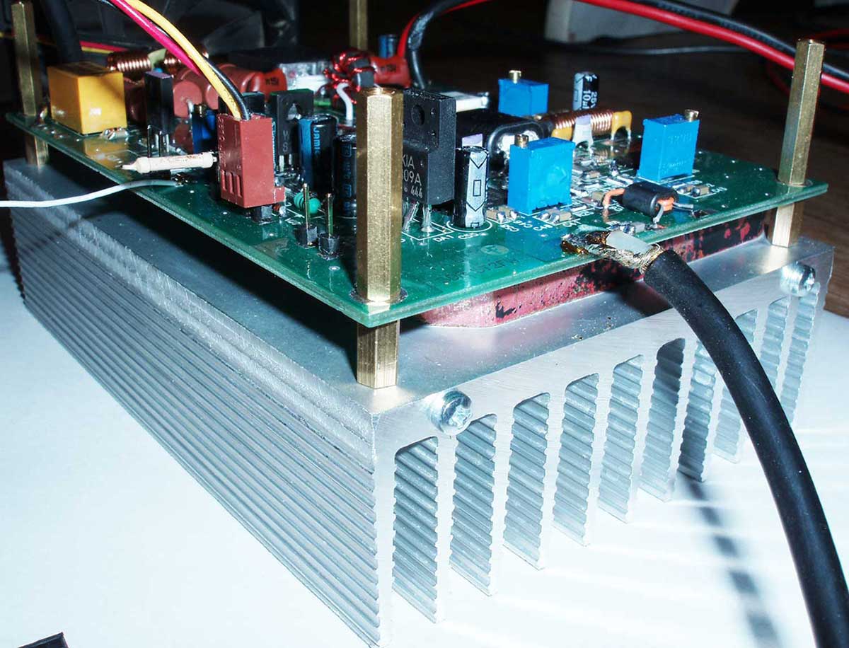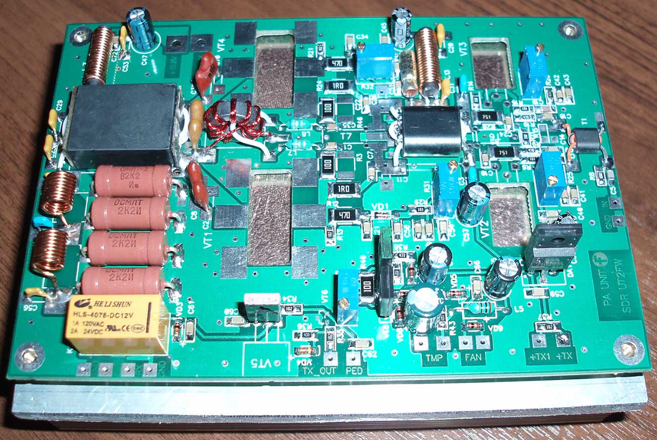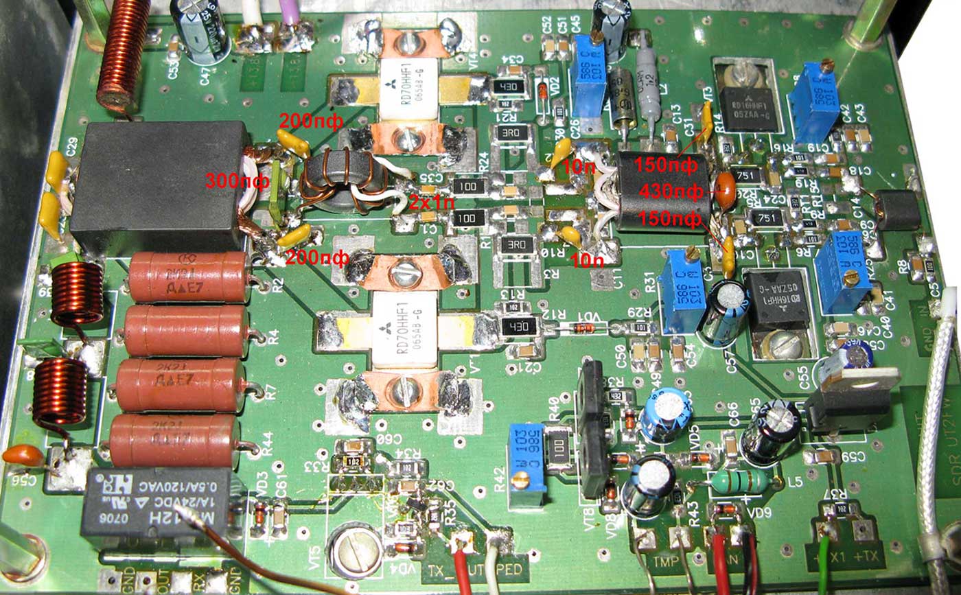 По теме, что "феррит тот же, витки те же" и т.д. - господа, каждый лепит из того, что есть - посему не факт, что у вас получится наиболее оптимальный вариант именно с указанными мной номиналами. Специально выкладываю фото рабочих плат, для того, чтобы были видны типы применяемых элементов. В мощных ШПУ уже не катят "абы какие" конденсаторы. Не любая керамика здесь будет качественно работать. И мощные ШПУ это не "микросхемные кубики", когда достаточно в плату впаять исправные микрухи и всё заработало. Повторяемость ШПУ будет высокой только в том случае, когда они выполняются из абсолютно одинаковых компонентов. И даже в этом случае иногда приходится корректировать частотозадающие элементы. Что же мы видим в реальной жизни? Достаточно почитать этот же форум - можно увидеть и какой "проволокой" бинокли мотают, и как паяют и т.д. и т.п. Посему и не следует надеяться на то, что если вы - "всё спаял по схеме" - этого будет достаточно, чтобы ШПУ получился. К тому же, RD70 свои будете применять - где гарантия, что они испечены в той же китайской "колхозной пекарне", где и те, которые у меня применяются?
