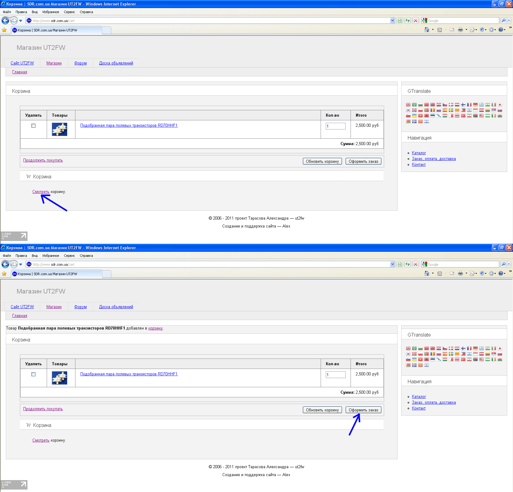 Ещё раз пропишу последовательность действий при заказе. Алгоритм создания заказа стандартный, т.е. выбрать товар, нажать на кнопку "Добавить в корзину" и ввести свои данные. Последовательность такая => Добавить в корзину => Оформить заказ => Ввести Е-майл и пароль (если ранее не регистрировался) => Следующая (ввести адрес, куда отправлять заказ) => Продолжить оформление (т.е. ввести данные о плательщике, если адрес доставки и плательщика совпадает, то достаточно поставить галочку о совпадении) => Продолжить => Подтвердить заказ => появится страничка "Вы сделали заказ. Номер заказа такой-то". На указанные вами Е-майл вам прилетит сообщении о заказе. Админу прилетит уведомление о вашем заказе.