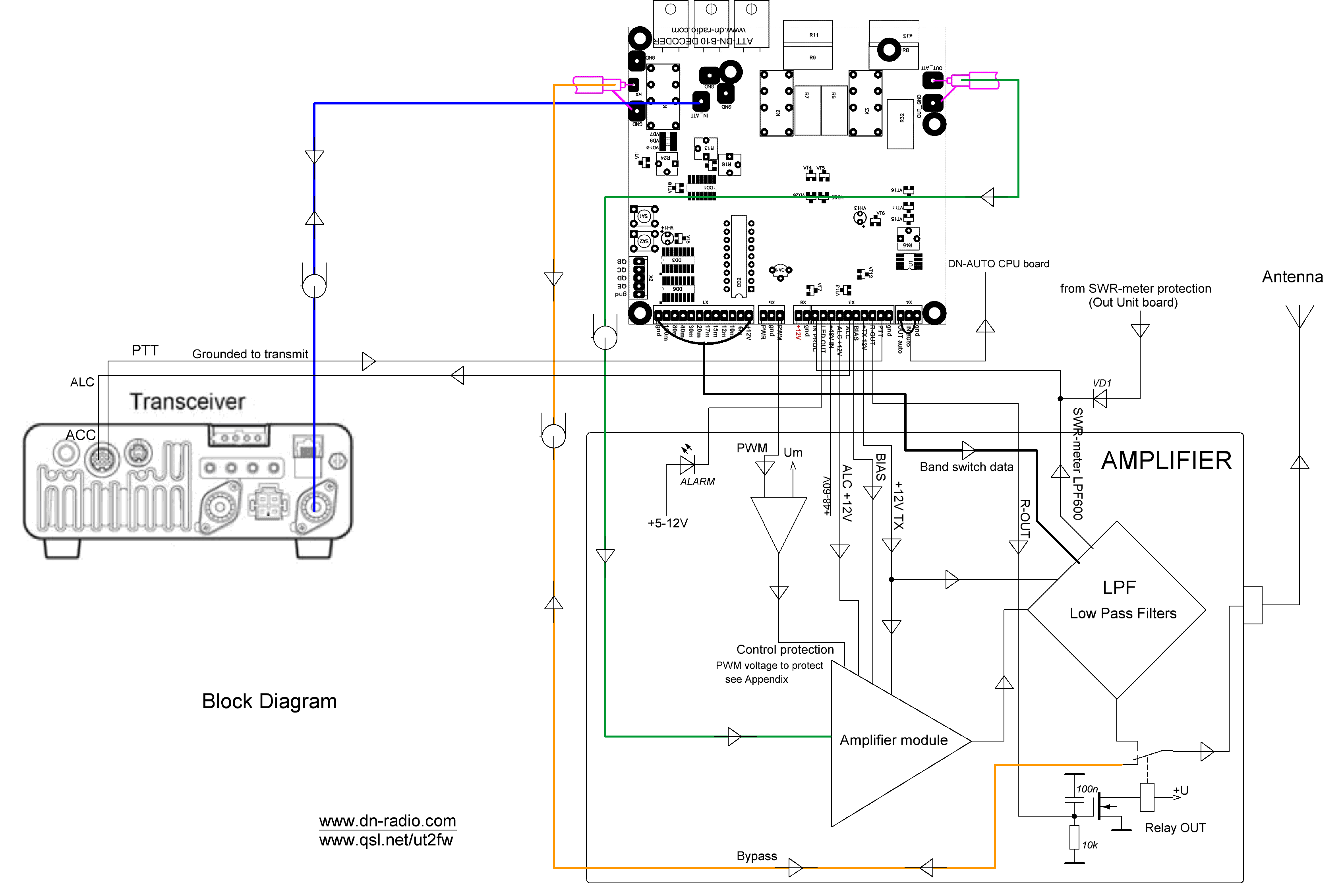 DN-AUTO из трех плат - DN-AUTO CPU, Controller Protections, ATT-DN-B10 обеспечивает полное управление защитами усилителя, вывод информации на LCD дисплей, на монитор компьютера (написана программа для компьютера AmpMonitor), управление LPF, антеннами и многие другие функции. Подробное описание