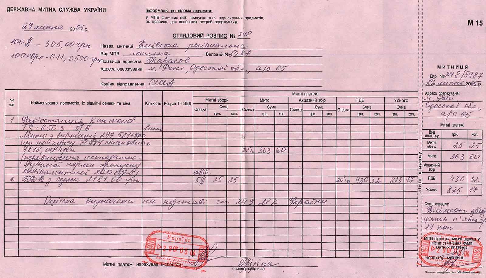 Пришлось столкнуться и с вариантом "непрозрачной уплаты налога". Этот случай случился, когда радио ехало через частную транспортную фирму. Видимо нашёлся какой-то "шустрик" именно в той фирме, который тормозил посылку с радио и ссылаясь, что типа - "таможня задержала радио", предлагал отстегнуть наличкой в баксах, дабы "порешать все вопросы". Дядя Саша на такую провокацию не повёлся, затребовал официальные бумаги из таможни. Понятное дело - никаких официальных бумаг не было предоставлено. Но началась "тягомотина" с постоянными телефонными звонками, уговорами, разговорами с различными "представителями от таможни", предоставлениями дополнительных "документов"... В итоге через месяц после приезда посылки в UA, радио благополучно приехало к получателю без всякой уплаты для "решения вопросов". В этом случае конечно нужно иметь железные нервы и спокойную уверенность в том, что лучше заплатить официально пошлину, нежели отстёгивать "на карман" подобным бызнэсмэнам.