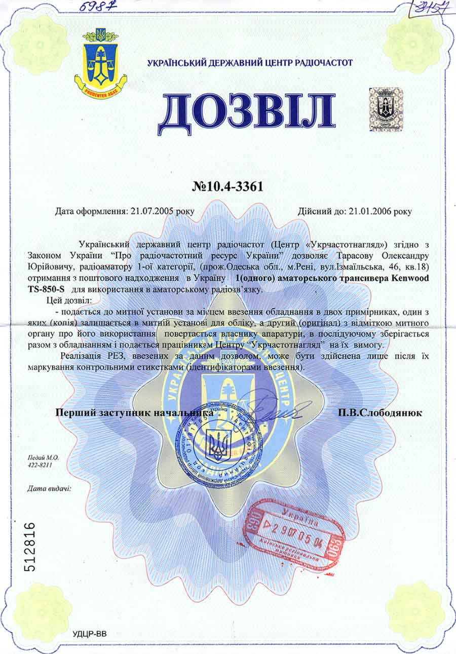 Разрешение на ввоз получаем в "Укрчастотнагляде" - в уведомлении есть координаты той службы. Для получения разрешения на ввоз в Укрчастотнагляд нужно предоставить копию своего разрешения, заполнить заявление и оплатить эту услугу. Таможня выставляет вам счёт к оплате, после оплаты которого и предоставления разрешения на ввоз, ваше радио благополучно отпускается и вы, с чувством огромнейшей благодарности за столь внимательное отношение к народным запросам, ожидаете его получения.