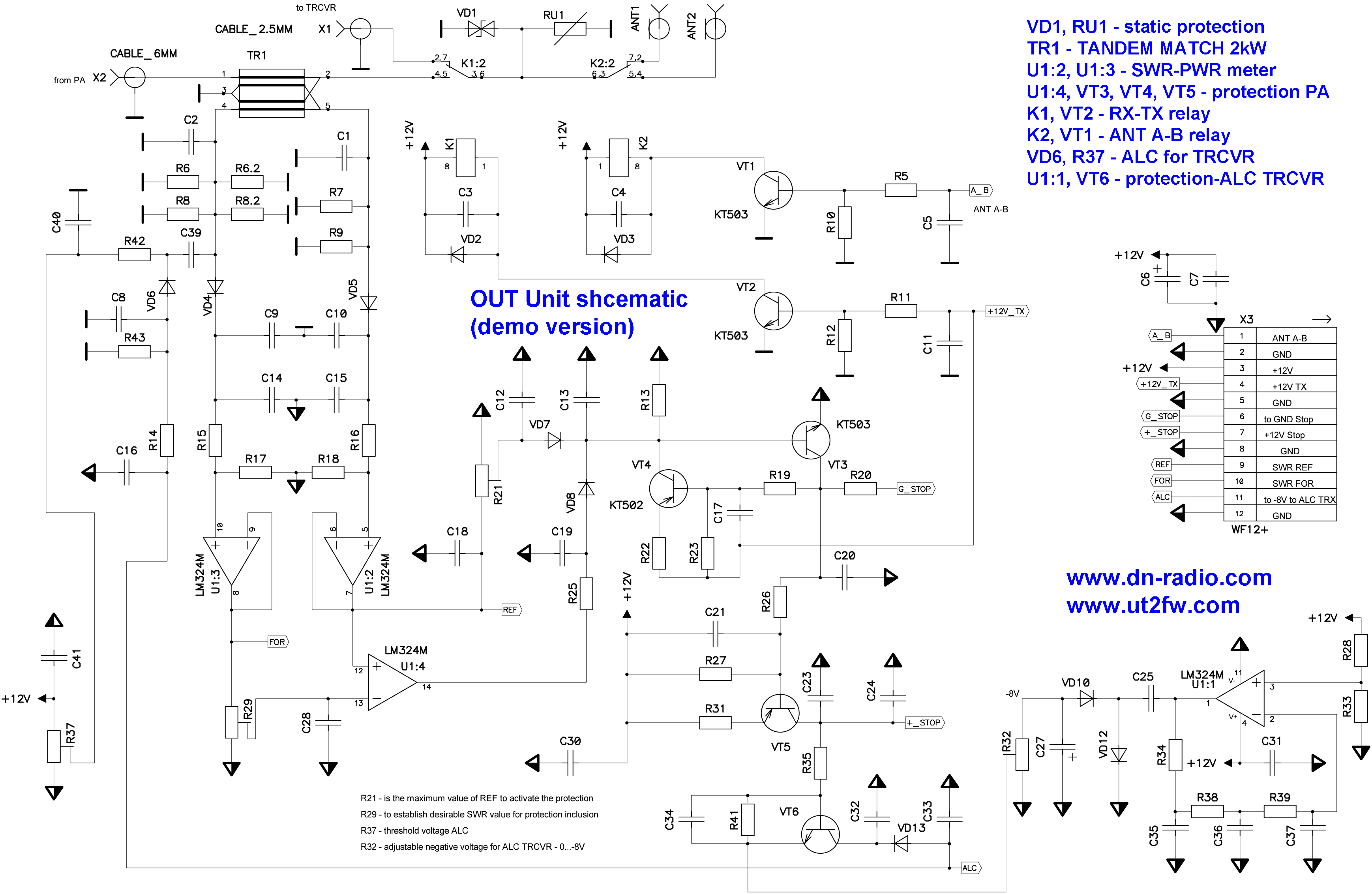 Функционал - измерение мощности, КСВ, защита при превышении КСВ, выход напряжения ALC (отрицательной полярности). Переключение двух антенн. Переключение выхода усилителя (до 2кВт) - т.н. выходное реле RX-TX. В состав платы входит: 1. Направленный ответвитель TR1, 2. Усилители U1:2, U1:3 для КСВ-измерителя МОЩНОСТИ, 3. Защита - компаратор U1:4, 4. Переключение ключей - VT3, VT4, VT5, VT6, 5. Реле RX-TX; ANT A - ANT B - K1, K2. VT1, VT2 управляют работой реле, 6. U1:1, VD10, VD12 формируют напряжение отрицательной полярности для ALC трансивера, 7. VD6, R37 - напряжение ALC, 8. VD1, RU1 - защита от статического напряжения в антенне. Размер сердечника TR1 10x20x15 мм позволяет измерять мощность не менее 2000 Вт. При этом сопротивление нагрузки должно составлять 50 Ом. Для управления защитой усилителя выходное устройство выдает несколько опционных сигналов: G_STOP - Открытый коллектор VT3 - до 100 мА, U<25 В +_STOP - выход +12 В до 100 мА ALC – выход до -10 В Если КСВ превысит значение (которое вы выберете в качестве резисторов R21, R29) - VT3 разомкнется. VT3 будет оставаться открытым через VT4, пока напряжение составляет +12 В_TX. При переключении в режим RX - защита отключается. A-B - переключение антенны A - антенны B. Для включения необходимо подать напряжение +5-12В. +12V_TX - Напряжение +12 В TX от усилителя, которое переключает усилитель из режима RX в режим TX. FOR – измерение мощности REF – измерение КСВ Размер печатной платы 90x71 мм