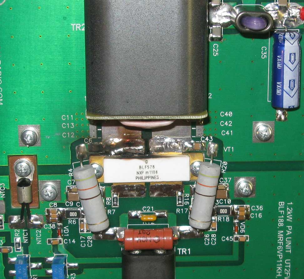 Итак, усилитель номер 1 (тот, что от “Дуная”). Впечатления от конструкции и ее работы в целом – очень положительные. Все работает практически сразу после сборки, однако с АЧХ и максимальной отдаваемой мощностью на всех бендах пришлось несколько повозиться. Опасения по поводу ненадежности подобных усилителей и обязательной необходимости схем защит от перегрузок и рассогласования с нагрузкой оказались напрасны - усилитель совершенно спокойно выдерживает отключение нагрузки и КЗ по выходу на полной мощности, а также издевательства в виде переключений диапазонов в процессе передачи тонального сигнала (конечно, так делать не нужно, хотя бы из соображений сохранности контактов реле, но факт есть факт). За 10 лет эксплуатации подобных усилителей мне лишь дважды удалось выпалить выходные транзисторы - один раз при настройке согласующего устройства на полной мощности на 40-метровом диапазоне (скорее всего, что-то очень неудачно попало в резонанс), а другой - при очередных регулировках, когда внезапно возникло сильное самовозбуждение всего тракта, быстро устранить которое не было возможности.