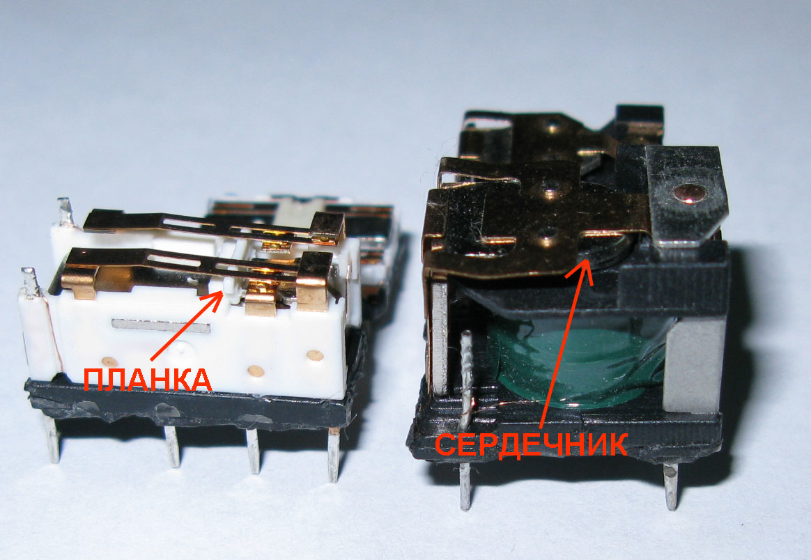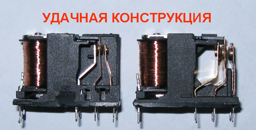 По SDR: я те релюхи разбирал, и емкостя мерял, и контакты позолочёные видал, знать даташеет не врёт, там всё нормально. По промерянной ёмкости к обмотке якоря - 4пФ, хотя в релюхах чё на ФНЧ у тя применяются - 3пФ. Так чё разница небольшая... И в анотации сказано что эти релюхи "сигнальные" т.ч. для cэбэ пойдёт...Смотря кем рисован тот даташит. Уже приводил в форуме примеры "негожих" типов релюх для ВЧ целей. Ещё раз вернусь, на этот раз с картинками. Ниже фото внутреннего вида различных реле. Что именно применять в своих конструкциях - это "дело личное - дело каждого". Реле, у которых средний контакт это якорь, который прилипает к сердечнику катушки - считаю что реле такой конструкции не место в ВЧ технике. Встречал реле у которых якорь при срабатывании даже имеет контакт с металлом сердечника.